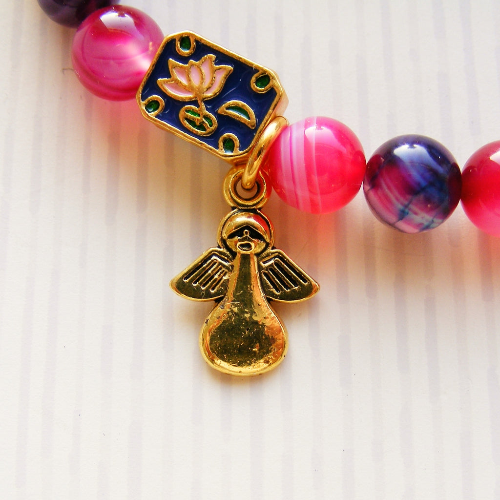 This unique handmade stretch bracelet is made from 8mm mixed banded agate beads with 2 gold coloured metal beads and a coloured metal flower bead.
