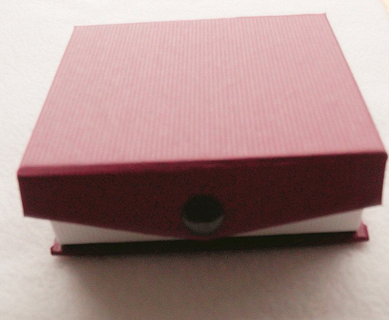 It comes in deep purple coloured textured paper covered gift box with white insert.