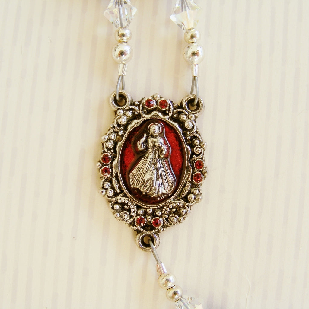This beautiful Divine Mercy Catholic rosary is handmade from 8mm carnelian beads, with white jade, purple jade, faceted dream agate and hematite beads. Faceted black onyx beads are used for each Pater (Our Father beads). An ornate silver plated crucifix and a full colour red enamel Divine Mercy centerpiece compliments this exquisite rosary. it is strung on strong beading wire and measures approx. 45cm in length when laid flat,