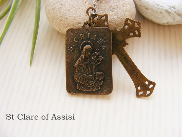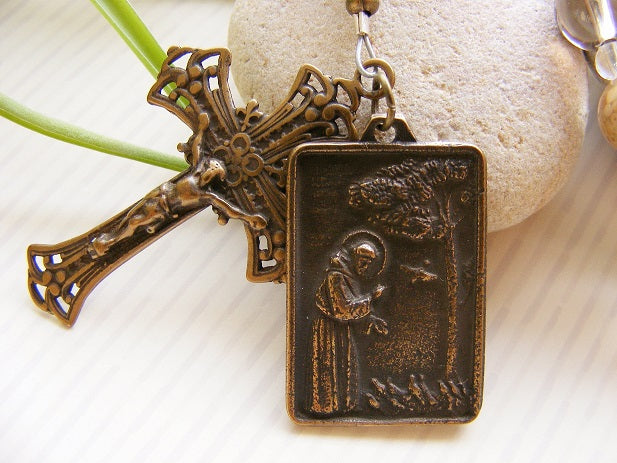 Measuring approx. 48cm in length when laid flat, this beautiful St Francis of Assisi Catholic rosary is handmade from 8mm bronzite, smoky quartz, silver smoke jasper, brown snowflake obsidian, faceted hematite beads and 10mm bronzite coin beads are used for each Pater. The crucifix, St Francis of Assisi (& St Clare) medal and the double sided Our Lady and Jesus centerpiece have been hand cast in America from antique pieces