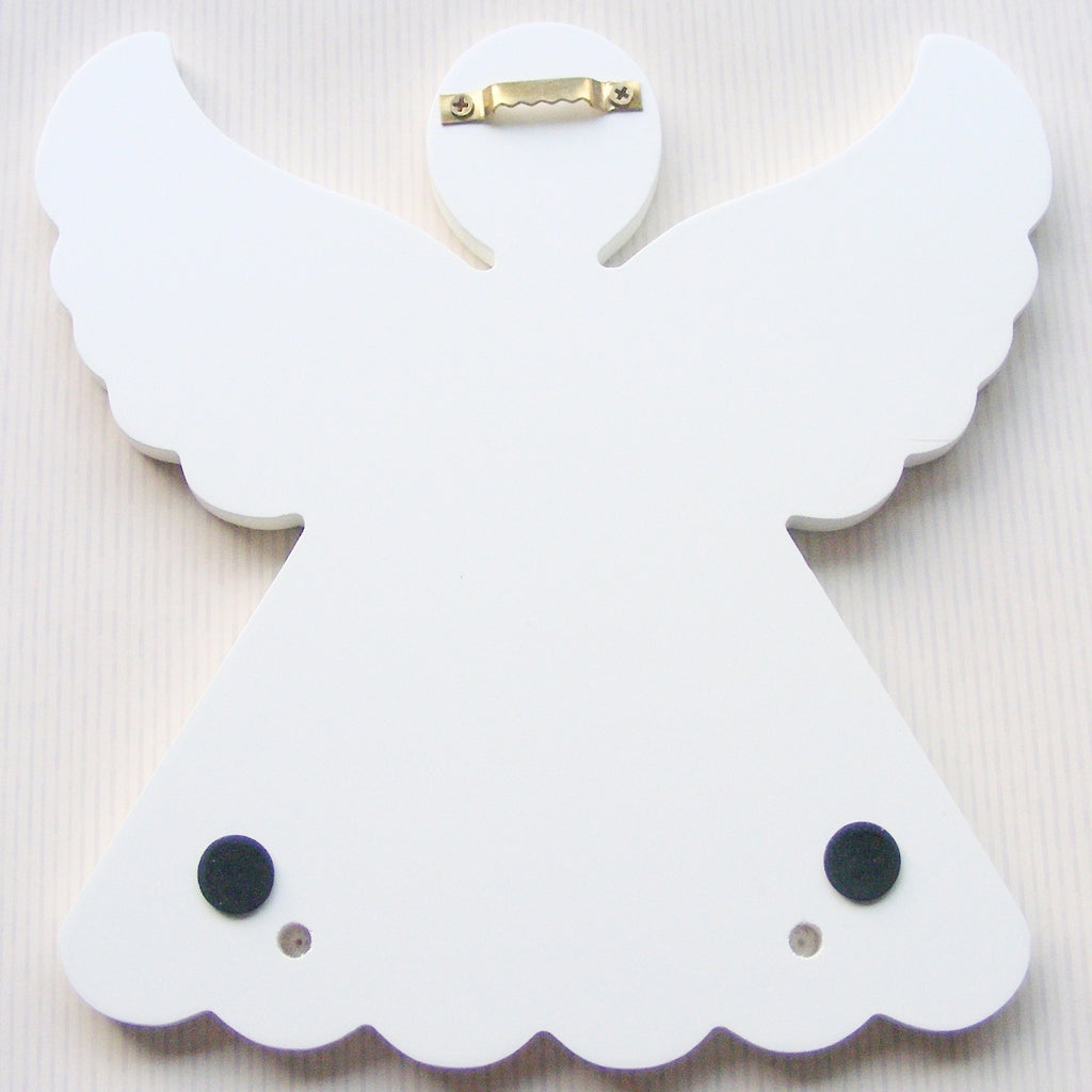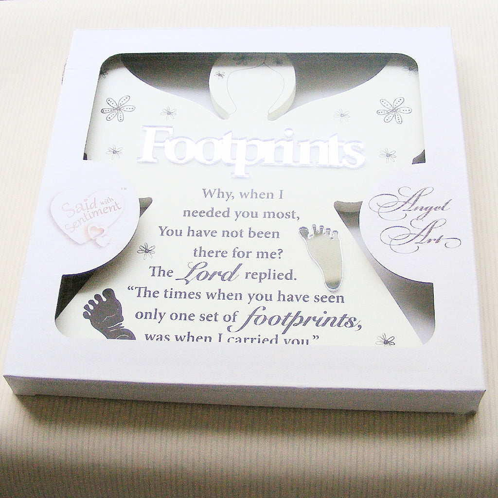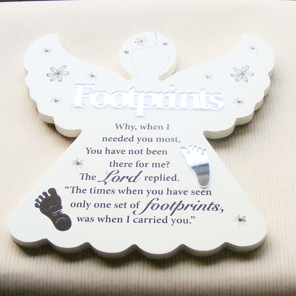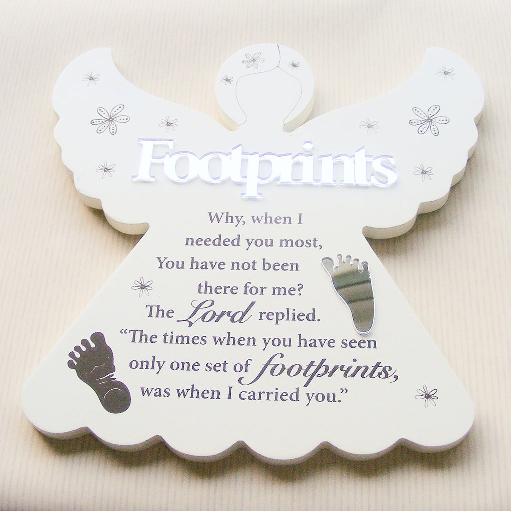 This beautiful wood plaque in the shape of a angel, has the popular footprints verse on the front and mirrored motifs.