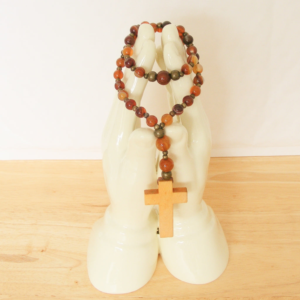 This Handmade Anglican rosary is made from 6mm Brown Banded Agate beads with antique bronze spacer beads and a natural wood cross.