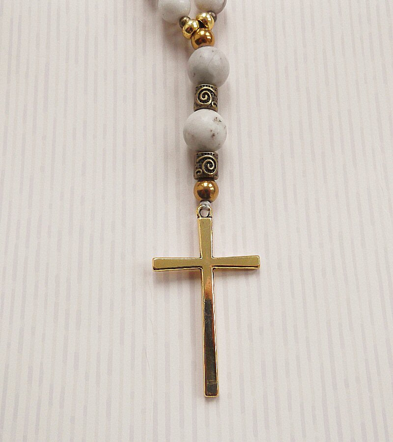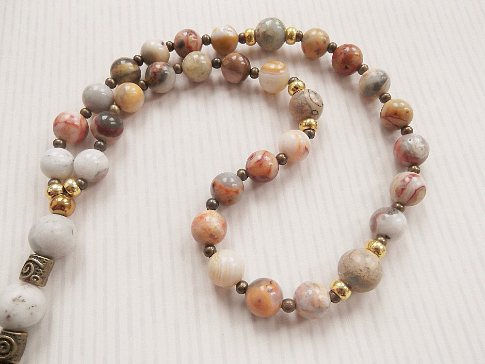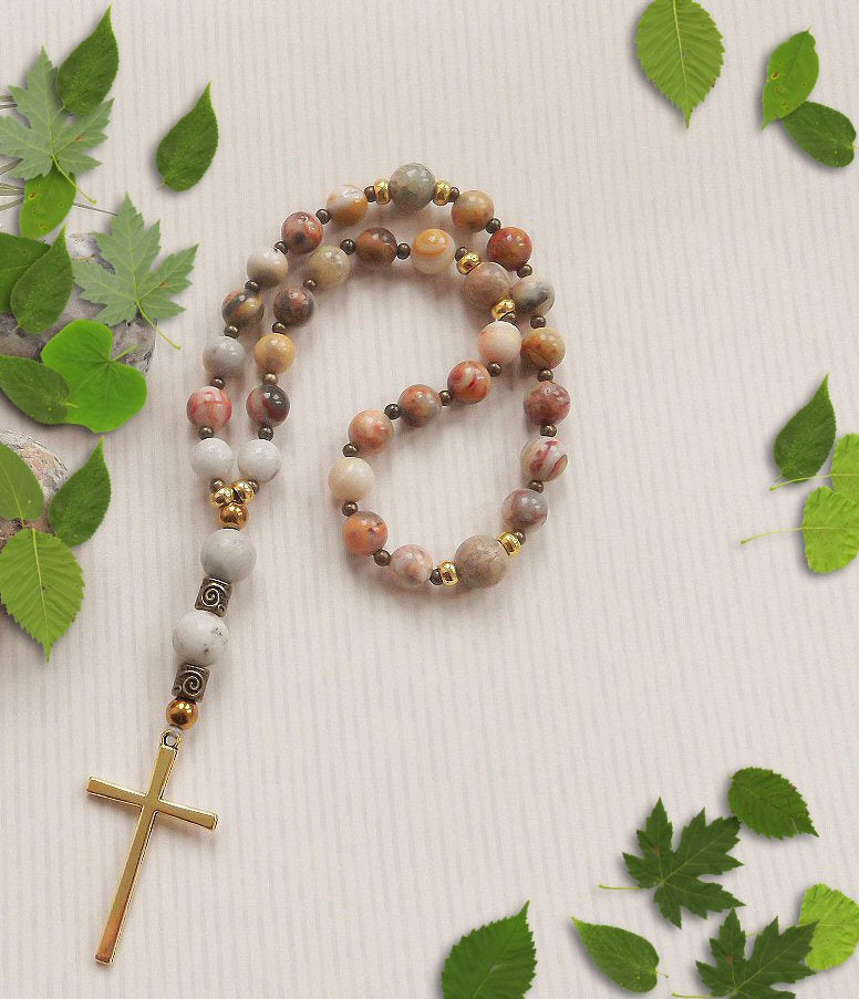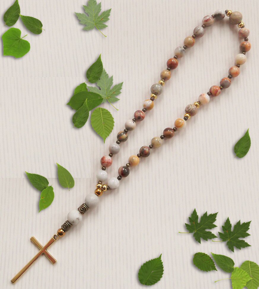 Measuring approx. 27cm in length when laid flat, this beautiful handmade Anglican rosary is constructed from 8mm Crazy Lace Agate and Peace Jade with tibetan style antique bronze and gold plated plated spacer beads, A plain gold coloured metal cross compliments this lovely rosary.
