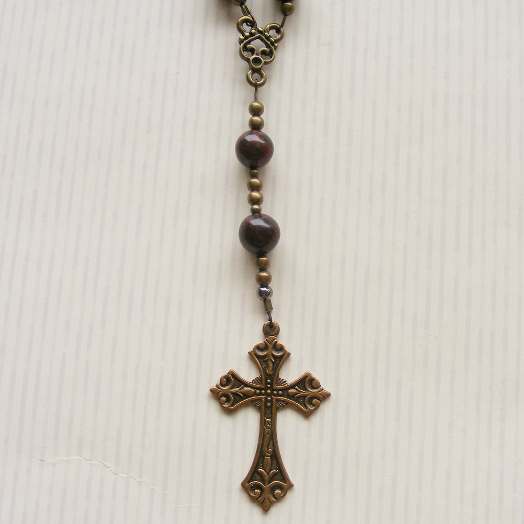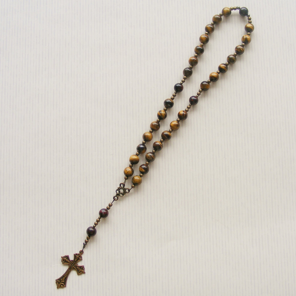 This Handmade Anglican rosary is made from 8mm Tiger Eye beads with antique bronze spacer beads, an antique bronze cross and centrepiece complete this beautiful rosary.