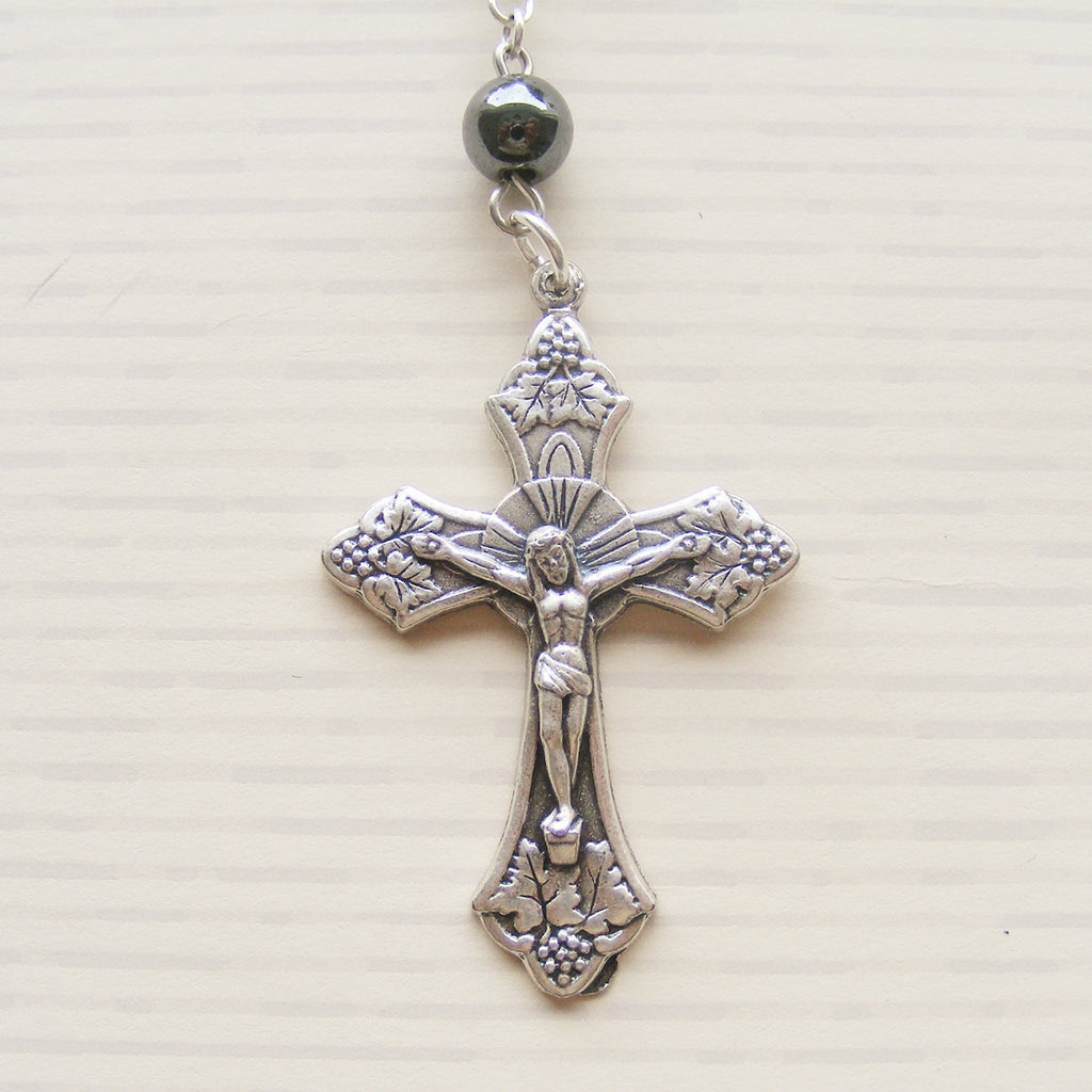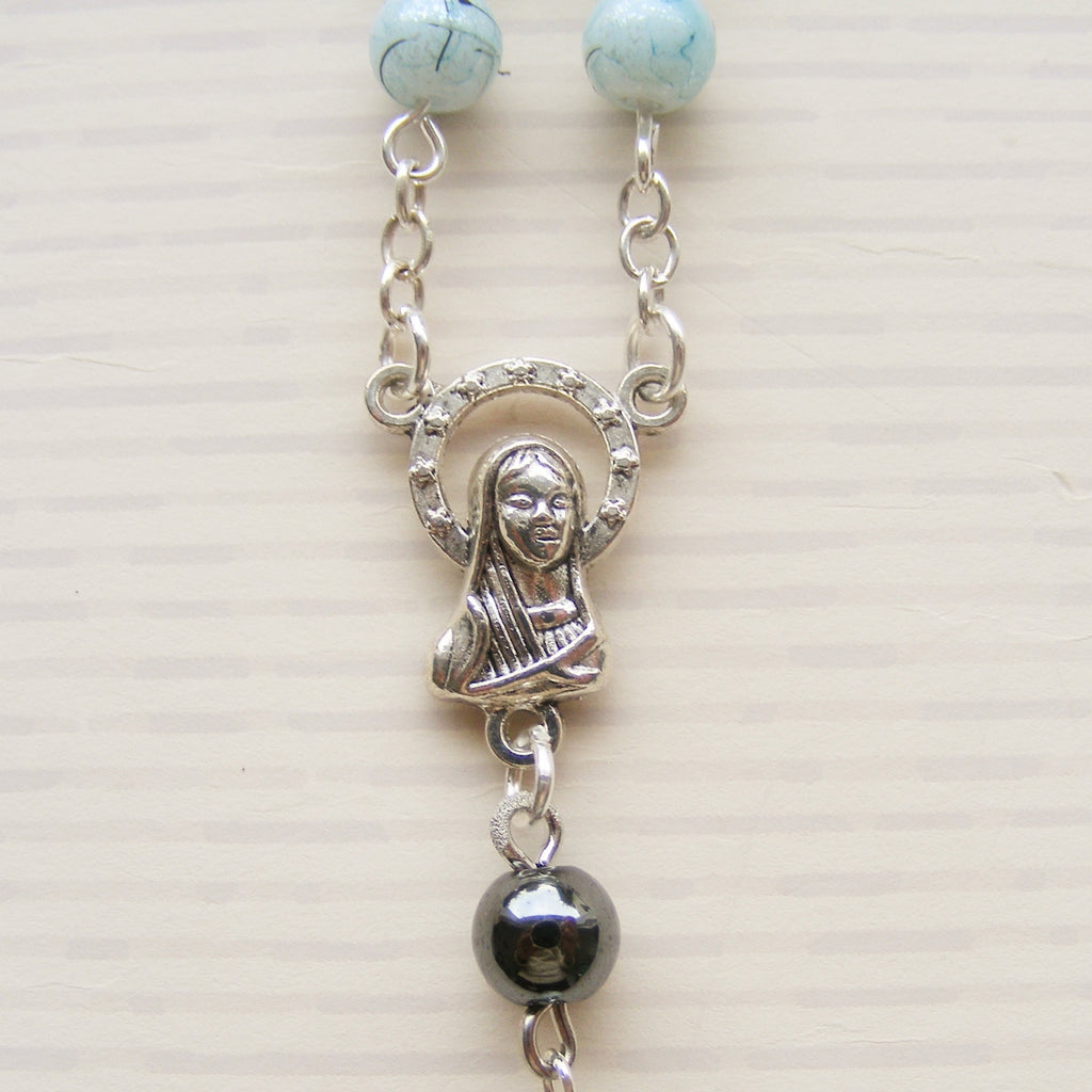 This beautiful chain link constructed Rosary measures approx. 48.5cm in length when laid flat. The  rosary is constructed from 6mm plae blue glass and hematite beads.  A silver plated Holy Mother centerpiece and a small silver plated detailed Crucifix completes this lovely rosary.