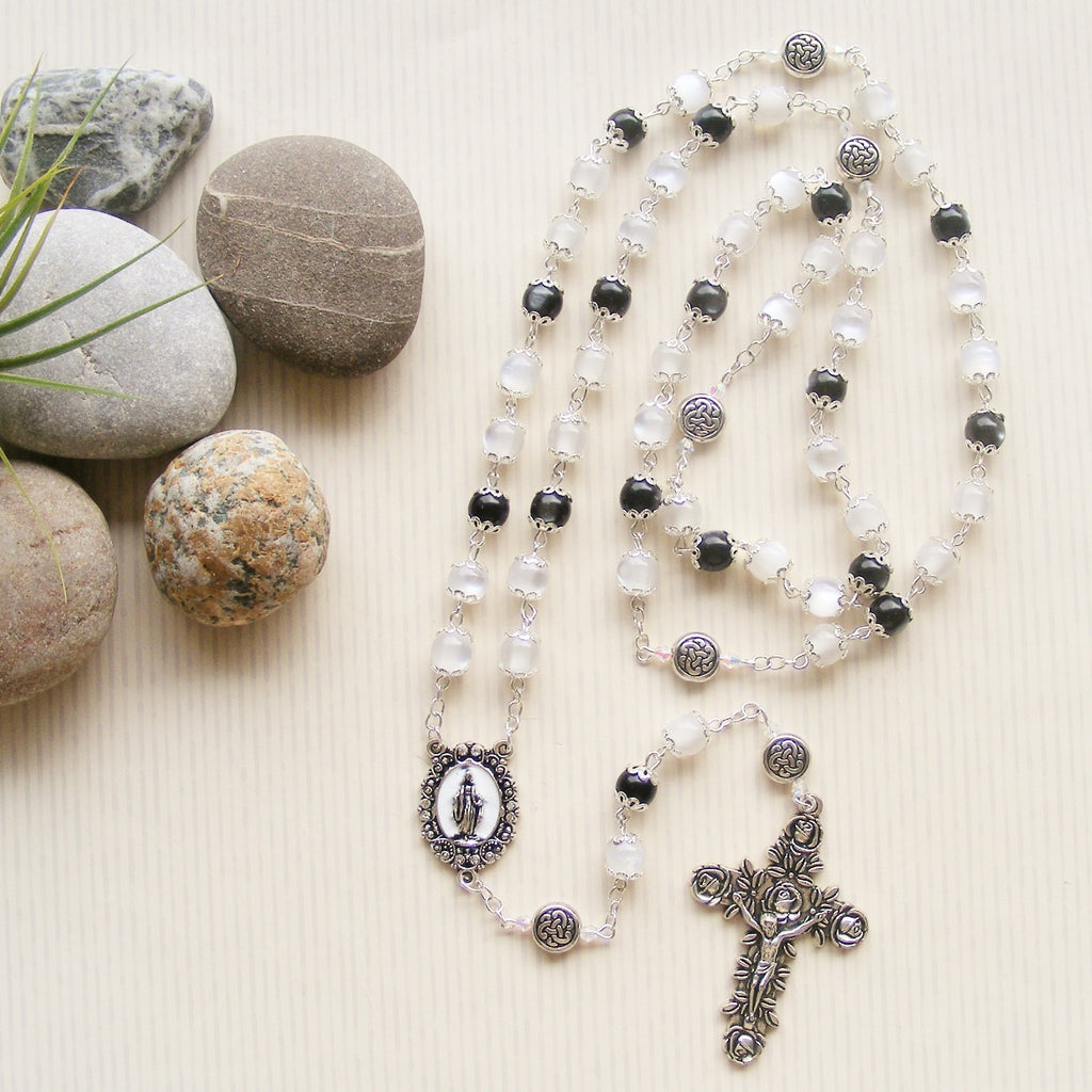 Measuring approx. 62.5cm in length when laid flat, this beautiful handmade rosary is constructed from 8mm glass pearl black and white beads with silver plated bead caps and silver plated celtic knot pater beads. A detailed crucifix and Miraculous Medal white enamel centerpiece complete this beautiful Rosary.