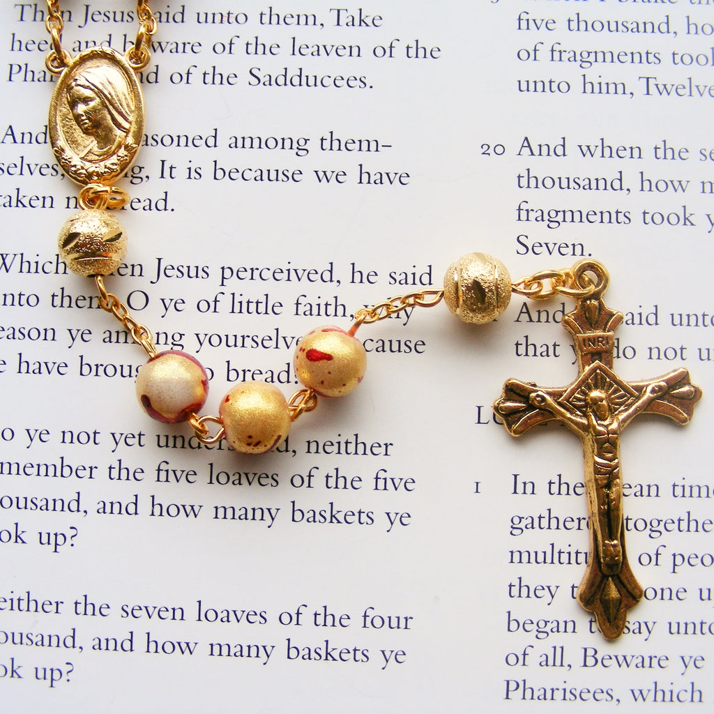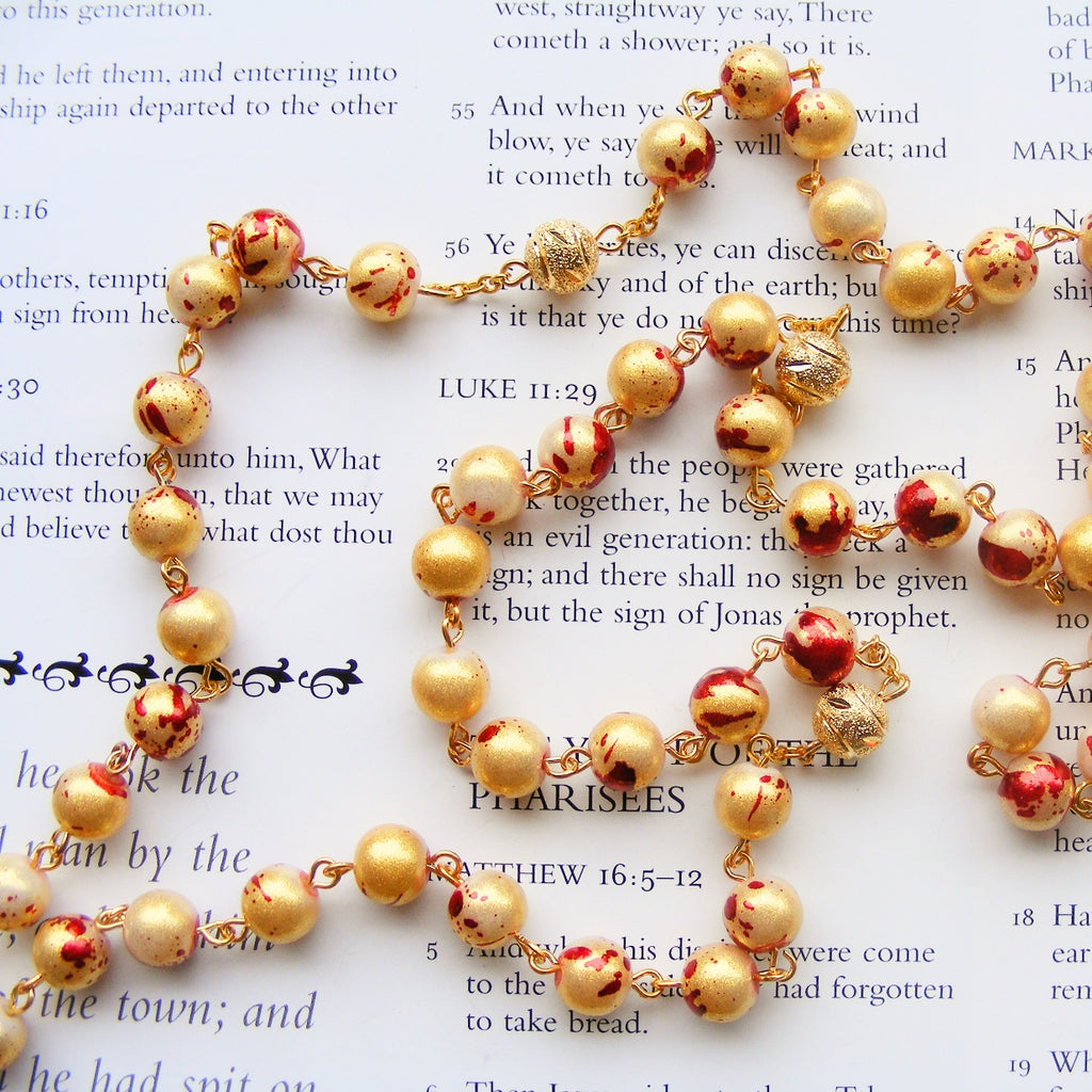 This unique handmade chain link rosary is constructed from 8mm red/gold glass pearl and gold plated beads. It has a detailed gold plated crucifix and double sided Holy Mother and Divine Mercy centrepiece.