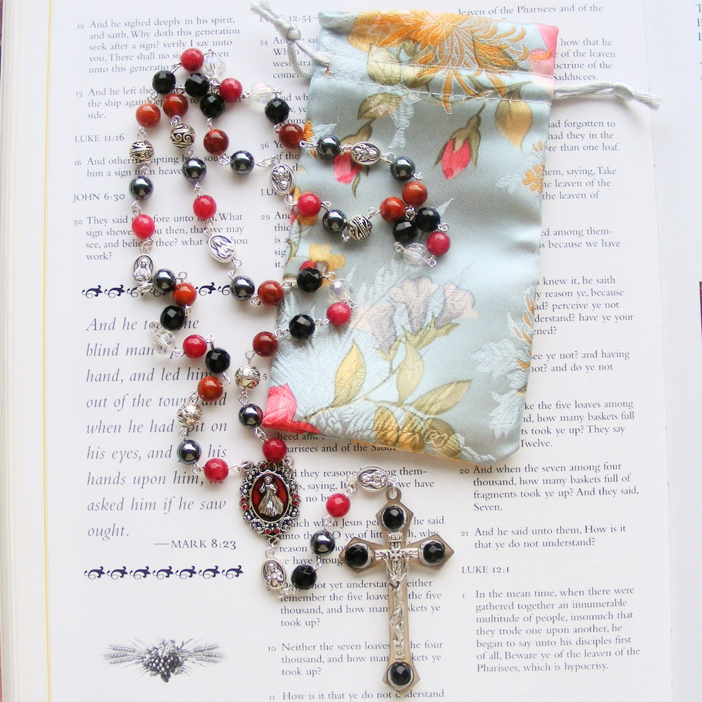 This unique handmade chain link rosary is constructed from 8mm gemstone, glass pearl,, tibetan style silver plated and double sided Sacred Heart and Holy Mother silver plated metal beads.  It has a detailed silver plated crucifix with black gemstones and a Divine Mercy red enamel centrepiece.