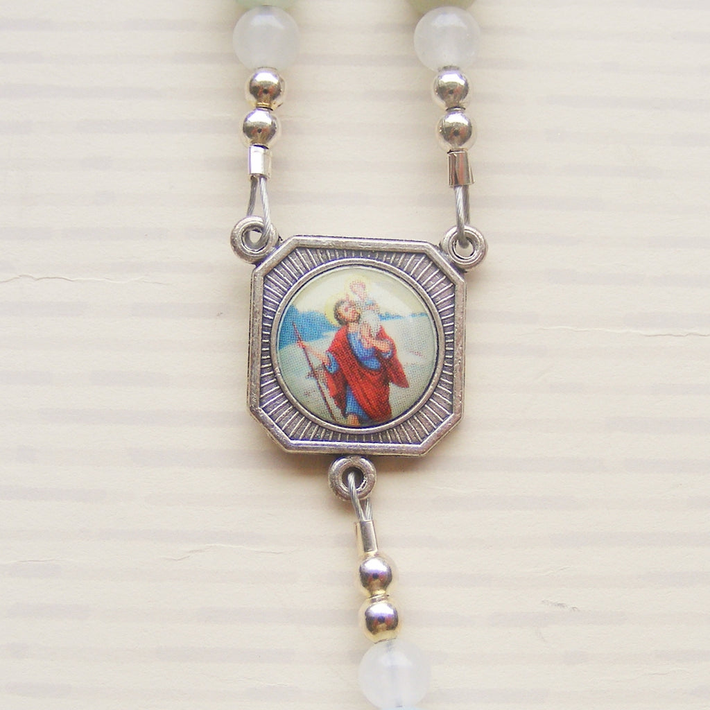 This Handmade Rosary features smooth 6mm amazonite beads, known for their calming properties, paired with a detailed Saint Christopher medal symbolizing protection during travels. Crafted with care, this Catholic rosary offers both spiritual significance and durable design, making it ideal for personal devotion or as a meaningful gift.