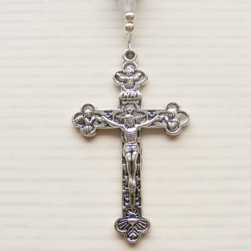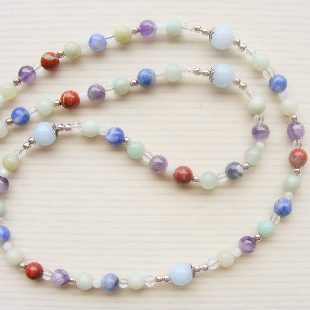 Measuring approx. 42cm in length, this beautiful handmade rosary is constructed from 6mm amazonite gemstone beads, amethyst, poppy jasper and sodalite beads, with silver accent beads and 3mm clear quartz spacer beads. 8mm blue lace agate beads are used for each Pater. A full colour Saint Christopher center completes this lovely rosary