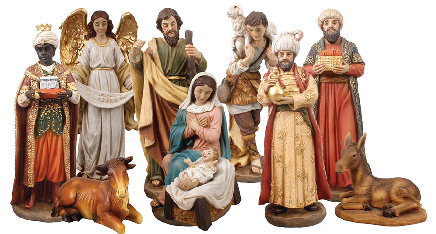They measure approx. 10" high (for the tallest figure) and are hand painted and have gold highlights. They consist of 10 figures.