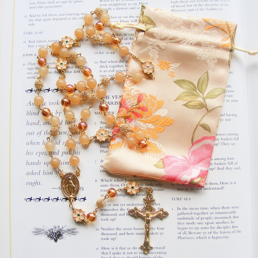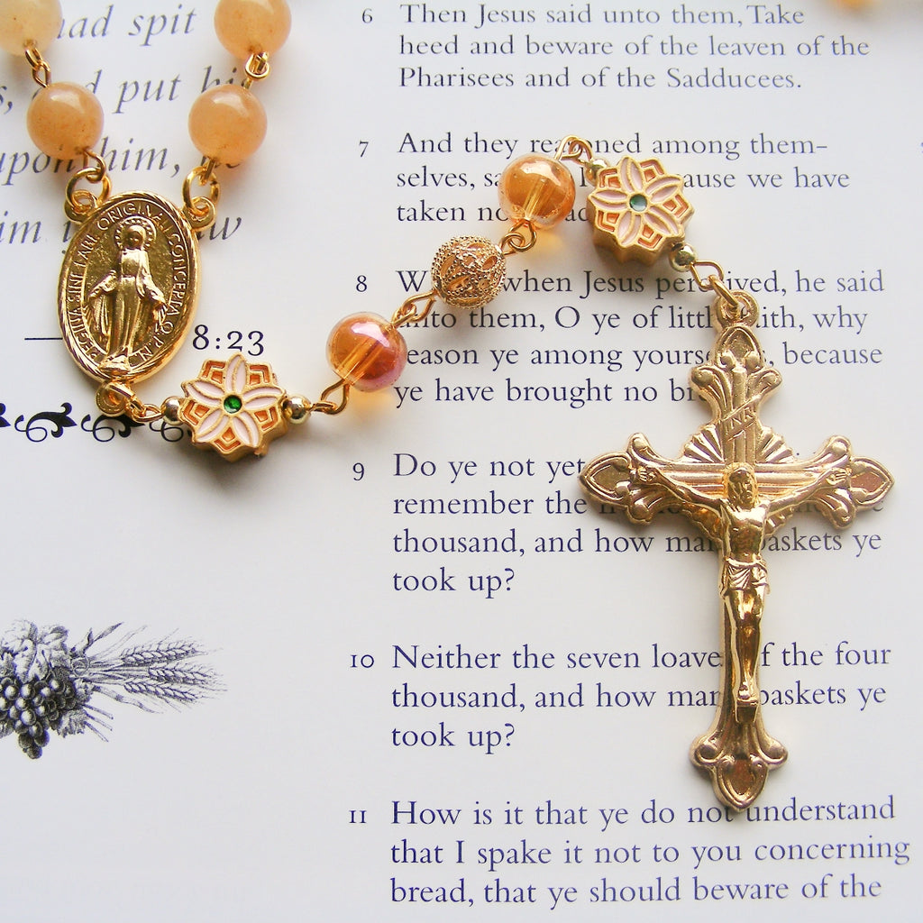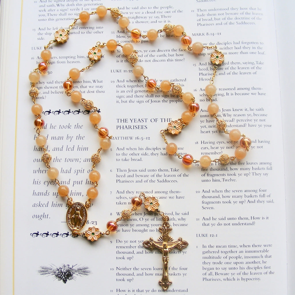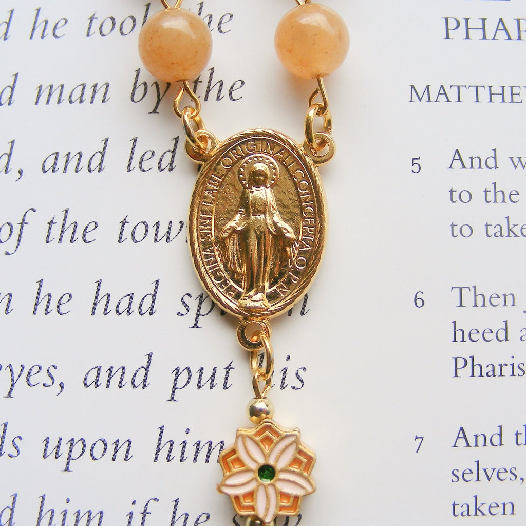 This unique handmade chain link rosary is constructed from 8mm gemstone , gold plated and metal floral beads. It has a detailed gold plated crucifix and Miraculous Medal centrepiece .