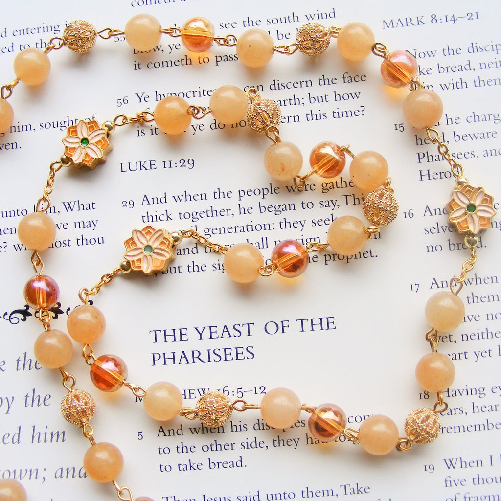 This designer rosary from the Handmade Heirloom Collection combines timeless Catholic devotion with exceptional craftsmanship. Each bead and element is thoughtfully selected and assembled to create a piece that is both elegant and spiritually resonant. Its sophisticated design makes it a treasured keepsake, perfect for prayer and reflection while honoring sacred tradition.