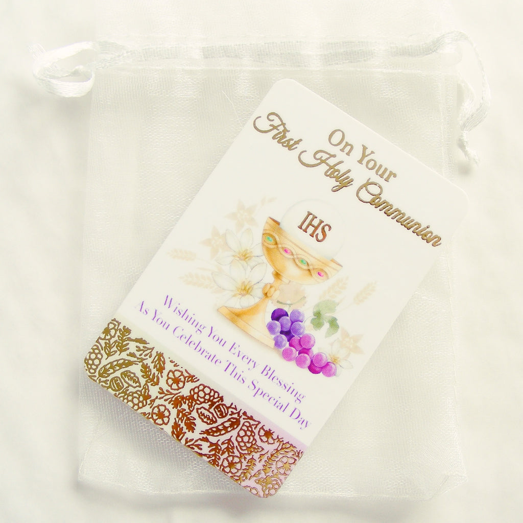 Comes supplied in a white organza bag with a First Holy Communion Prayer card.