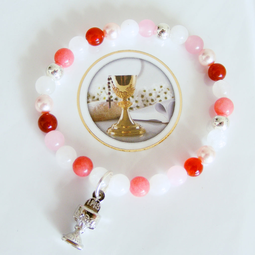 Lovingly created from extra strong beading elastic, this handmade holy communion bracelet is constructed from 6mm white jade, rose quartz and pink jade beads. Comes with a silver plated Chalice charm attached.