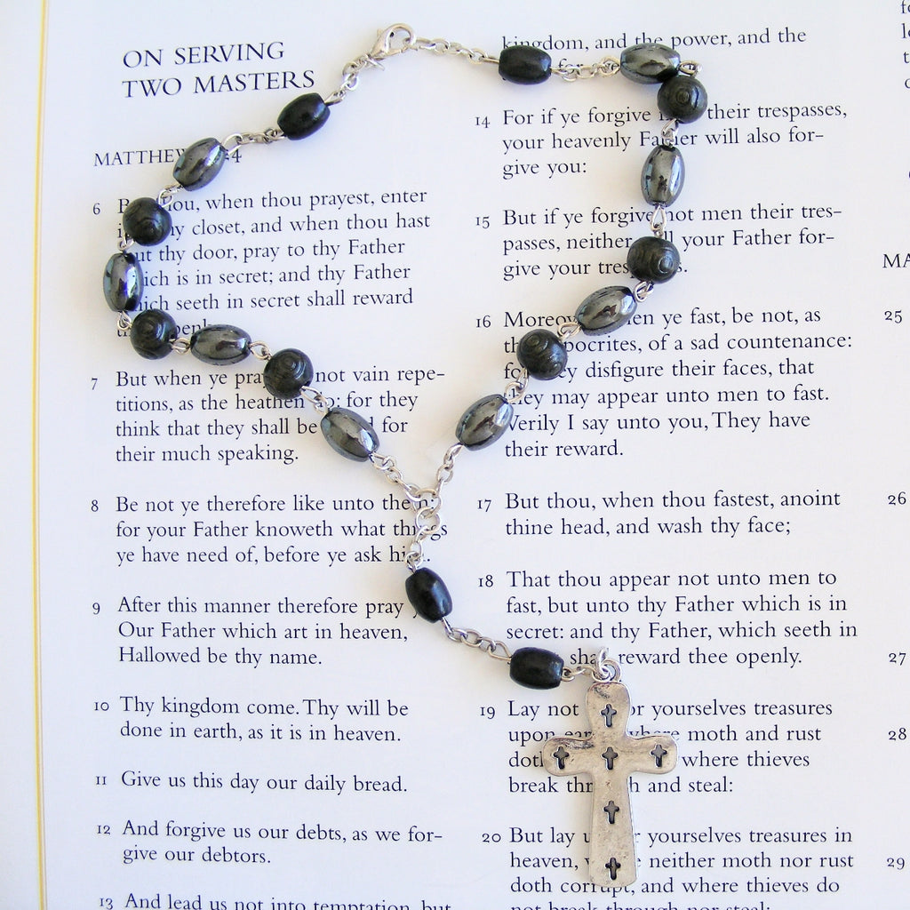 Measuring approx. 22.5cm in length when laid flat, this beautiful handmade Anglican Car rosary is constructed from Black wooden beads and Hematite beads . It has 14 Week beads and 4 Cruciform beads. It has a silver plated cross with cut-outs which compliments this lovely rosary.